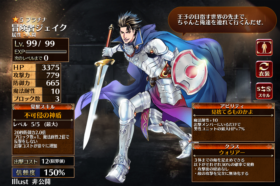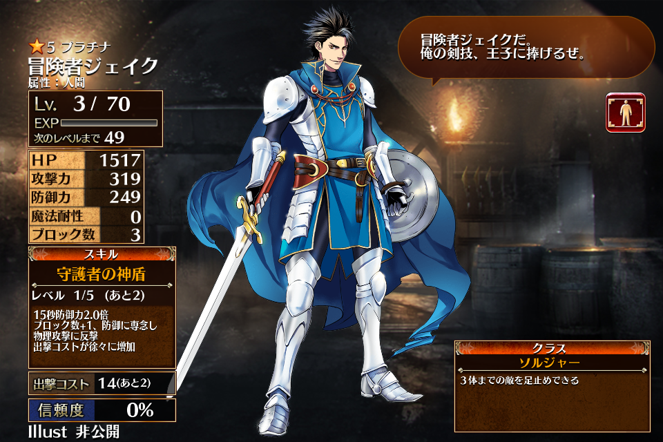 | プ ラ チ ナ | ![]() 冒険者ジェイク | ソルジャー | Lv3 | 1517 | 319 | 249 | 0 | 3 | 14 | 9 | 攻撃力+36 防御力+72 HP+270 | 守護者の神盾 | - | 編 集 |