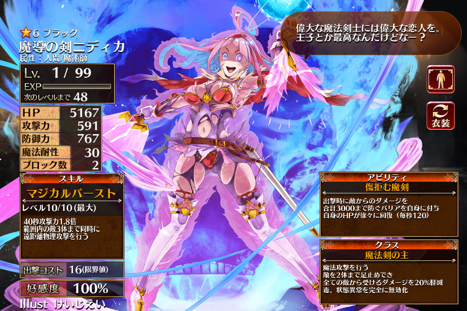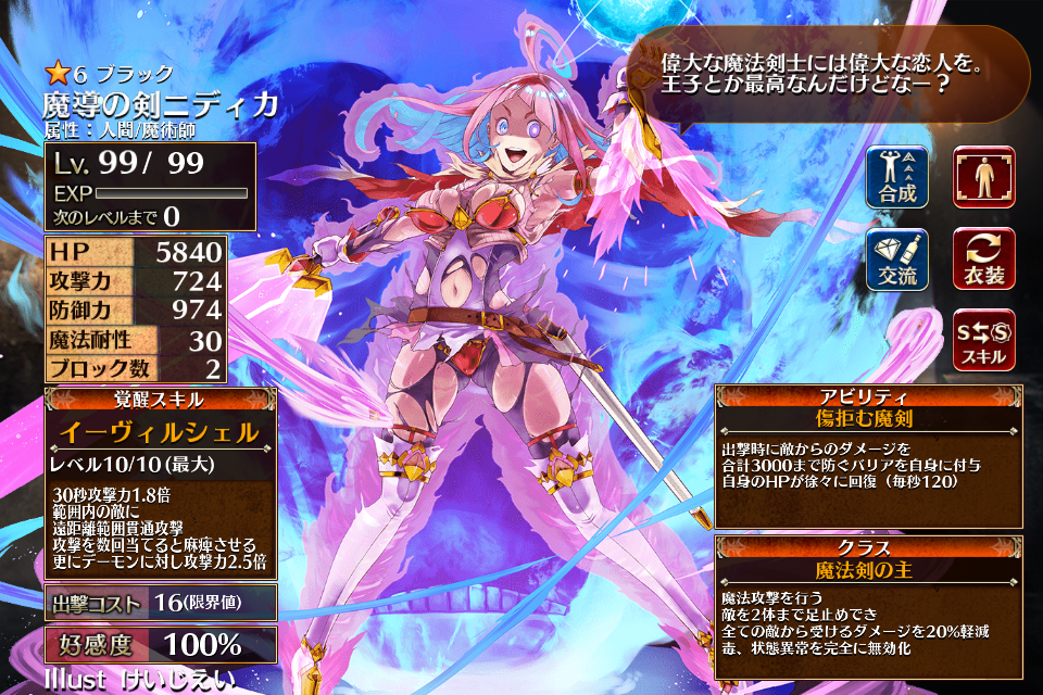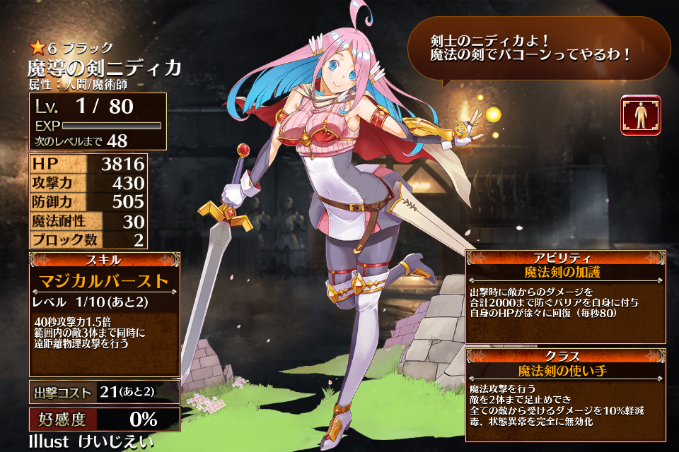 | ブ ラ ッ ク | ![]() 魔導の剣ニディカ | 魔法剣の使い手 | Lv1 | 3816 | 430 | 505 | 30 | 2 | 21 | 16 | HP+672 防御力+134 | マジカルバースト | 魔法剣の加護 | 編 集 |