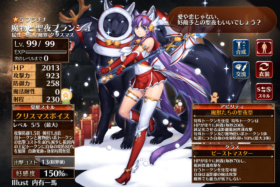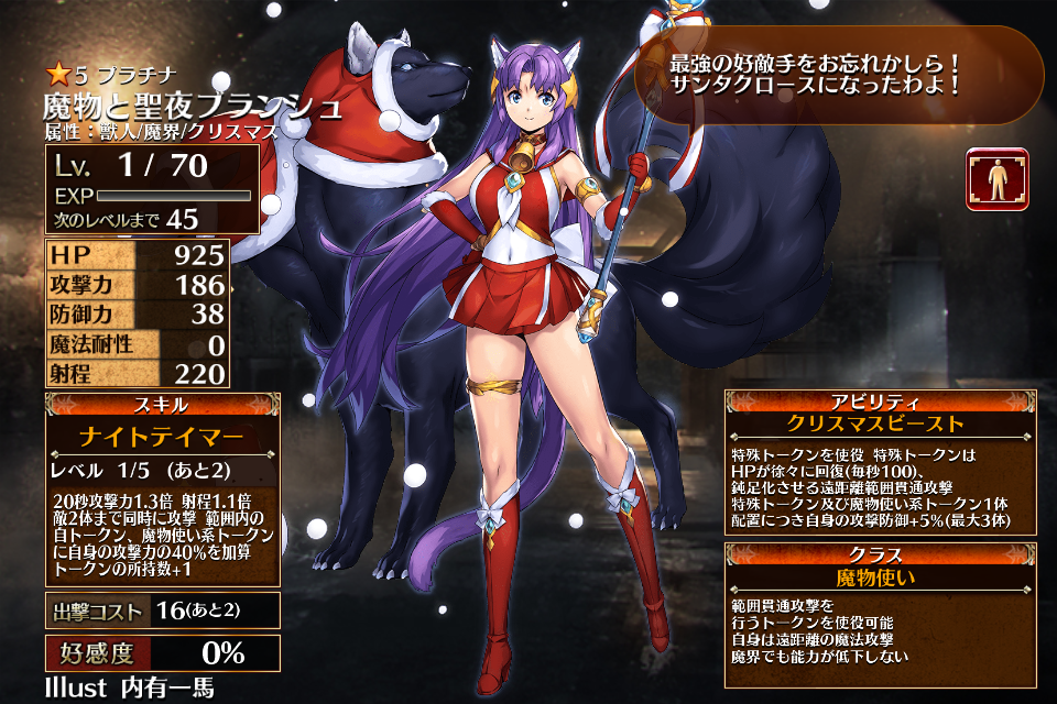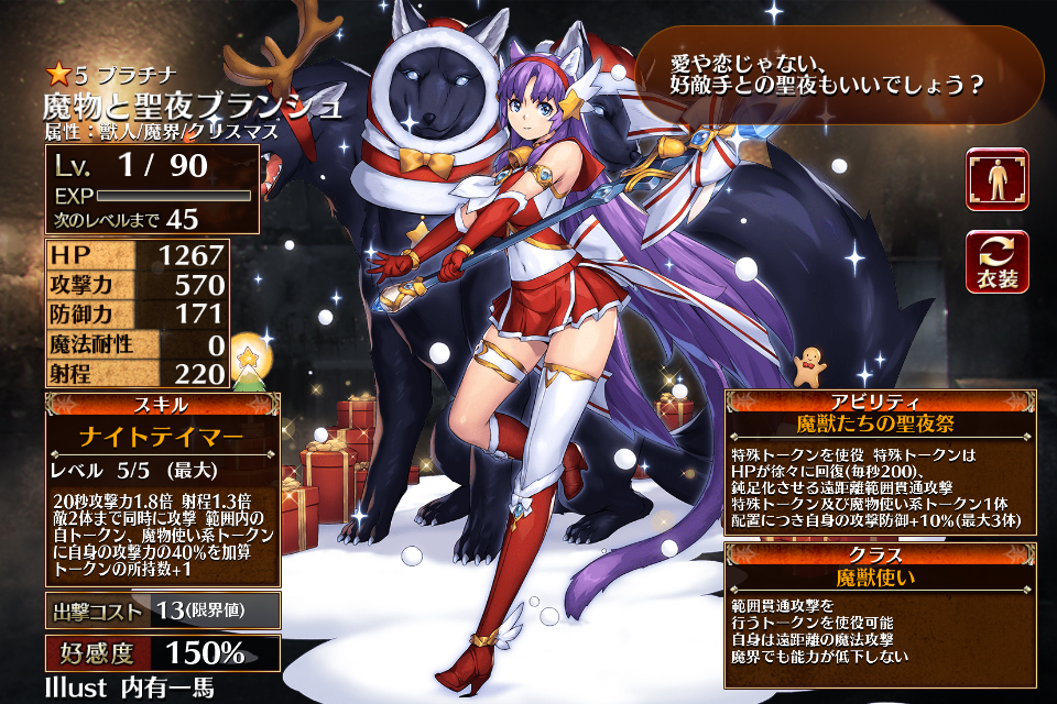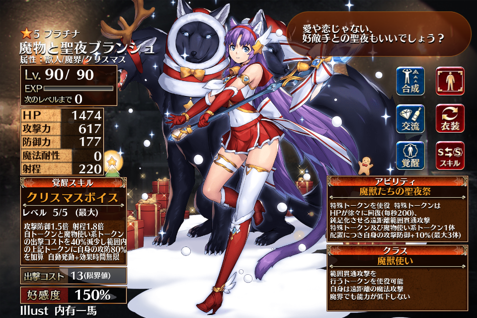 | 覚醒 | クリスマスボイス | 攻撃防御1.5倍 射程1.8倍 自トークンと魔物使い系トークンの出撃コストを40%減少し範囲内の上記トークンに自身の攻防80%を加算 自動発動+効果時間無限 | 初動まで30秒 | 回復まで60秒 |