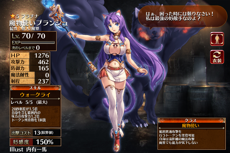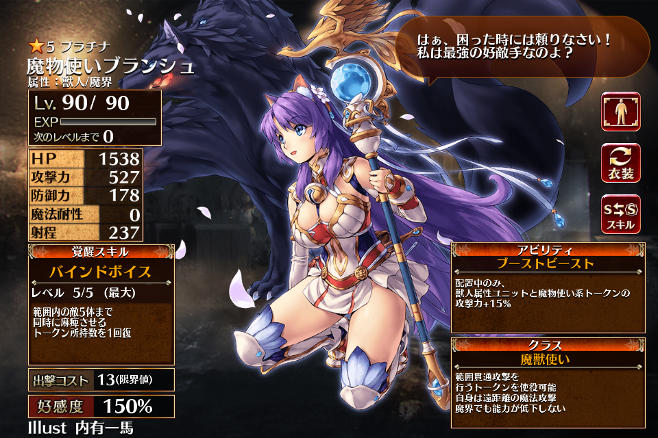 | プ ラ チ ナ | 魔物使い ブランシュ | 魔物使い | Lv1 | 965 | 178 | 39 | 0 | 220 | 16 | 13 | 攻撃力+144 防御力+72 射程+17 | ウォークライ | - | 編 集 |