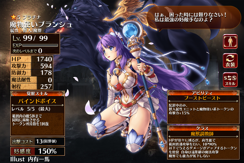 覚醒アビリティ「ブーストビースト」により、配置中のみ獣人属性ユニットと魔物使い系トークンの攻撃力+15%。