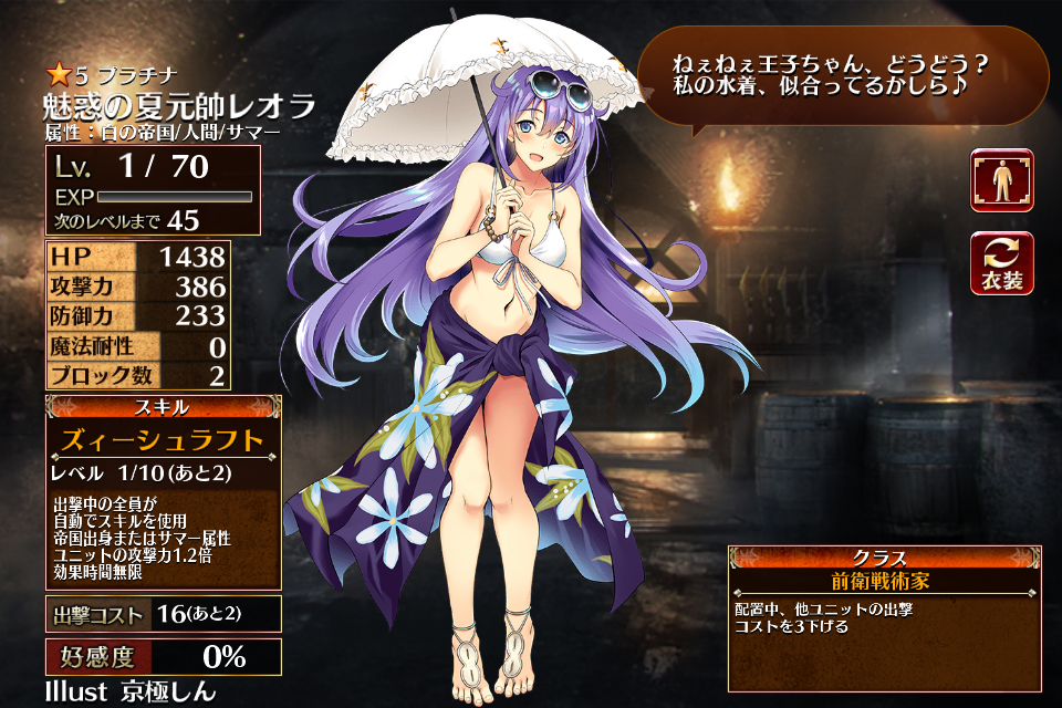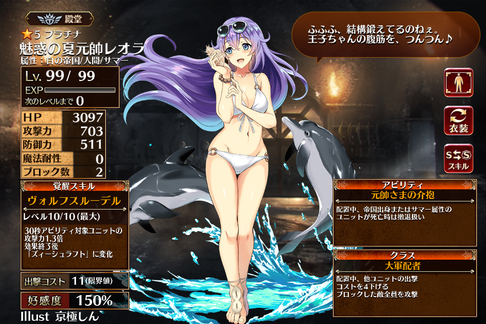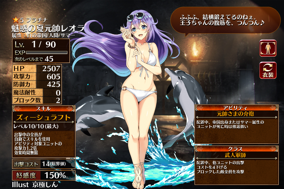 帝国元帥レオラのサマー属性バージョンで、イベントユニットの中でもスキルオート要員として重要な存在。