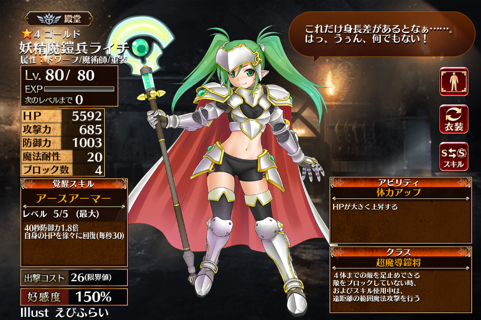 | レ ア | 名前 | クラス | 初期 | HP | 攻撃 | 防御 | 魔 法 耐 性 | ブ ロ ッ ク | コスト | 好感度 ボーナス | スキル | アビリティ | ||