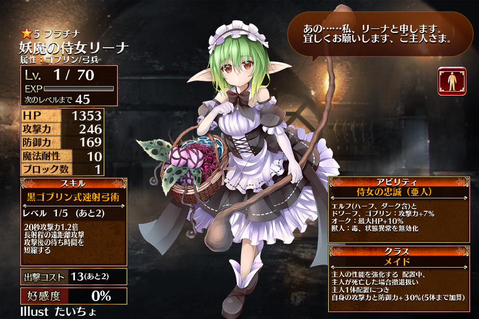 | メイド長 | Lv1 | 2200 | 337 | 345 | 10 | 1 | 13 | 10 | HP+360 攻撃力+144 物理攻撃回避+24% | 黒ゴブリン式速射弓術 ↓ ↑ 妖魔のおもてなし | 侍女の献身(亜人) | |||