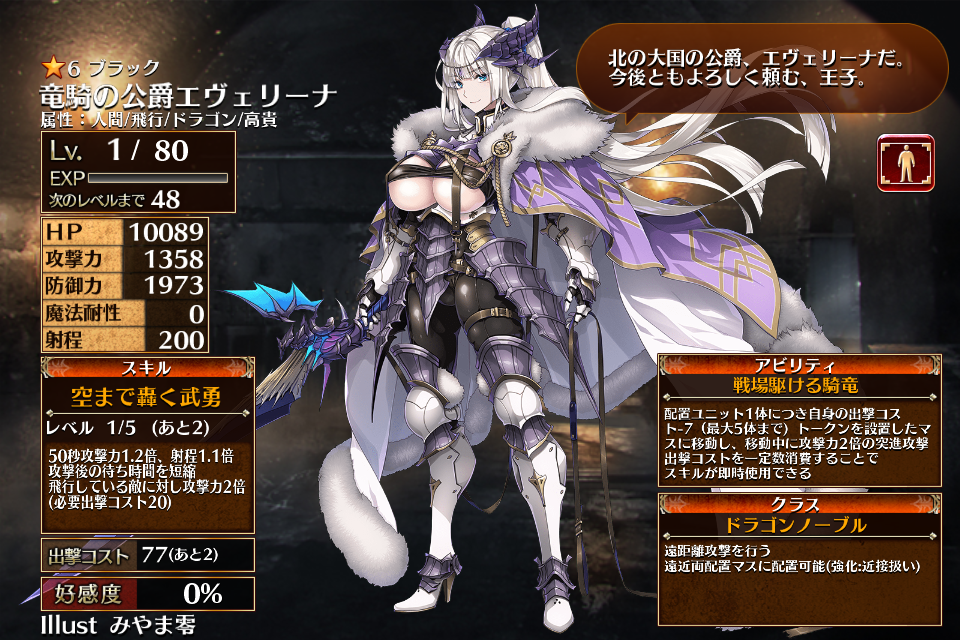 | ブ ラ ッ ク | ![]() 竜騎の公爵 エヴェリーナ | ドラゴンノーブル | Lv1 | 10089 | 1358 | 1973 | 0 | 200 | 77 | 74 | ??+?? ??+?? ??+?? | 空まで轟く武勇 | 戦場駆ける騎竜 | 編 集 |