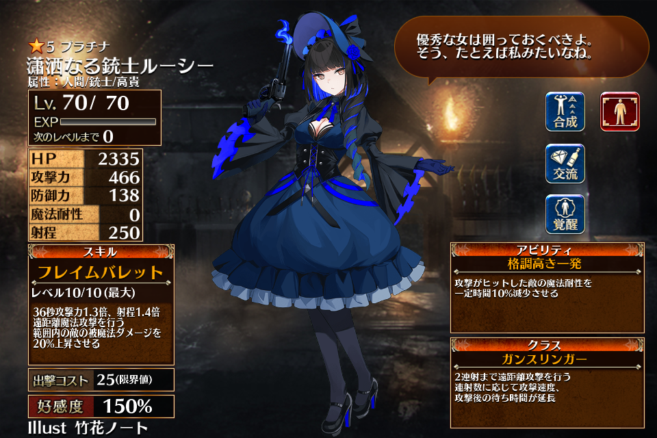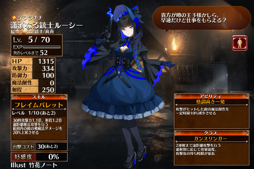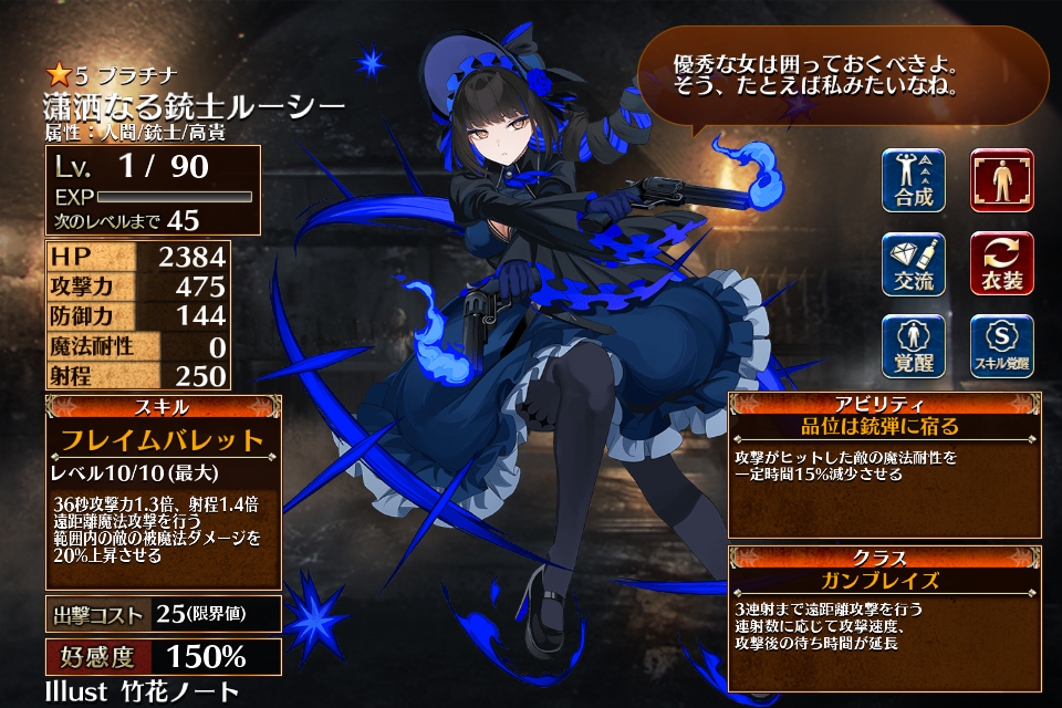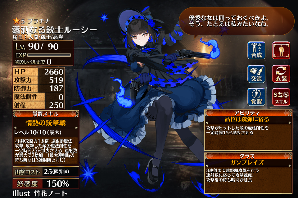 | プ ラ チ ナ | ![]() 瀟洒なる銃士 ルーシー | ガンスリンガー | Lv5 | 1315 | 334 | 100 | 0 | 250 | 30 | 25 | HP+720 攻撃力+72 スキル効果時間+20% | フレイムバレット | 格調高き一発 | 編 集 |