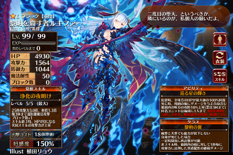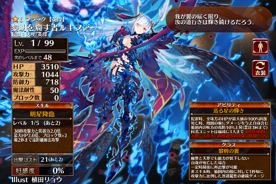 クラスは黎明の翼で、同名の英傑に黎明を齎す者ルキファ【白金英傑】(白ルキファ)がいる。