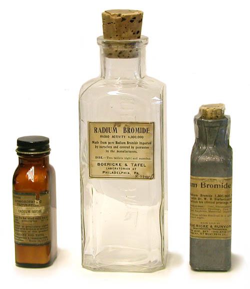 臭化ラジウムを含むホメオパシー粉末は、1960年代にペンシルバニア州の薬品会社から販売された。ボトルにある"6X", "8X", "18X"は臭化ラジウムの希釈率である。右側のボトルの鉛ホイルは、その厚みではラジウムからの放射線被曝を削減する効果を持っていないに等しい。