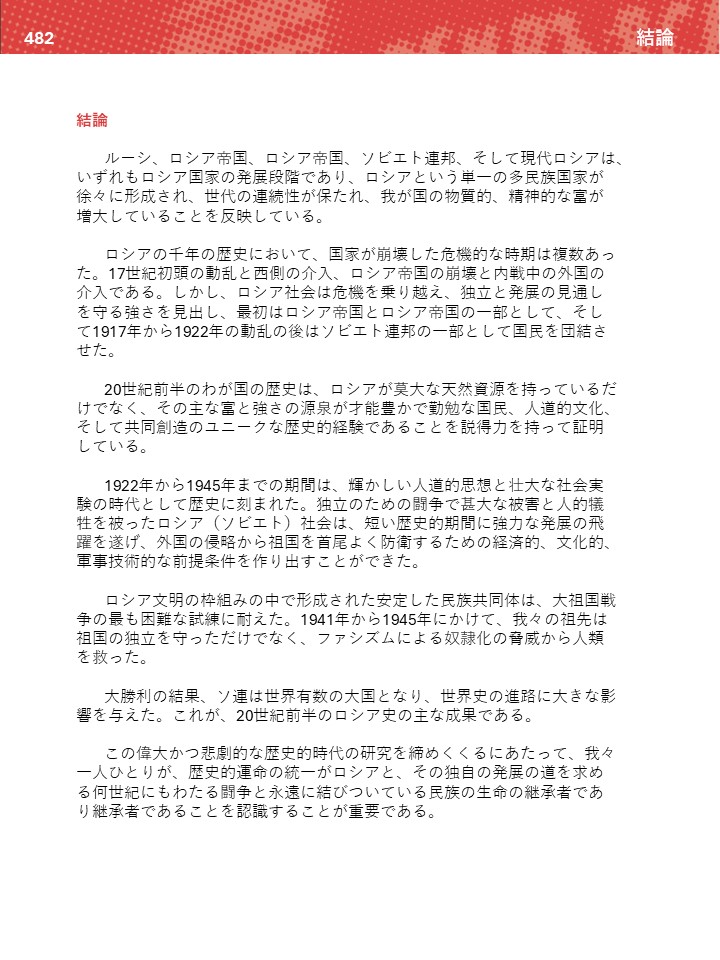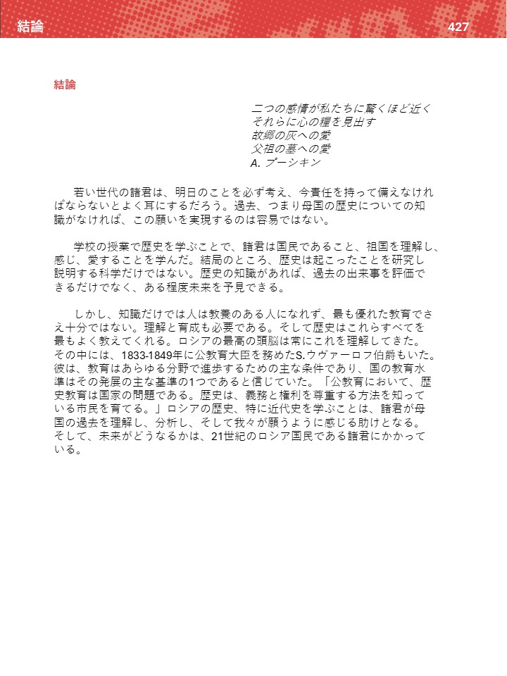 この偉大かつ悲劇的な歴史的時代の研究を締めくくるにあたって、我々一人ひとりが、歴史的運命の統一がロシアと、その独自の発展の道を求める何世紀にもわたる闘争と永遠に結びついている民族の生命の継承者であり継承者であることを認識することが重要である。