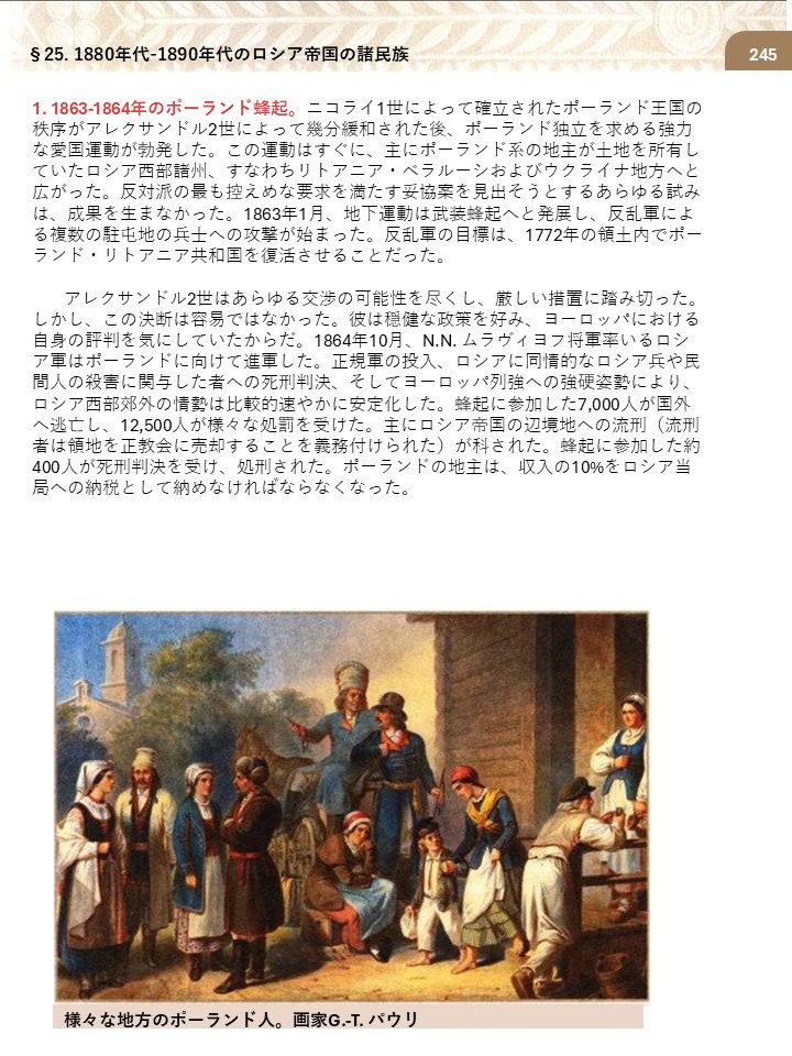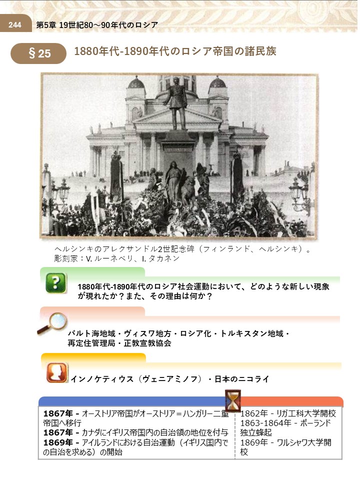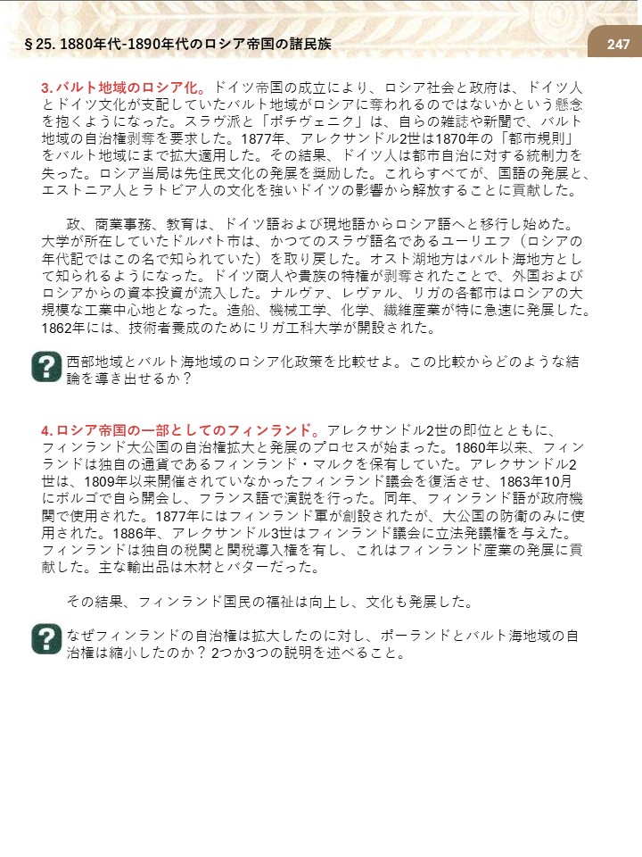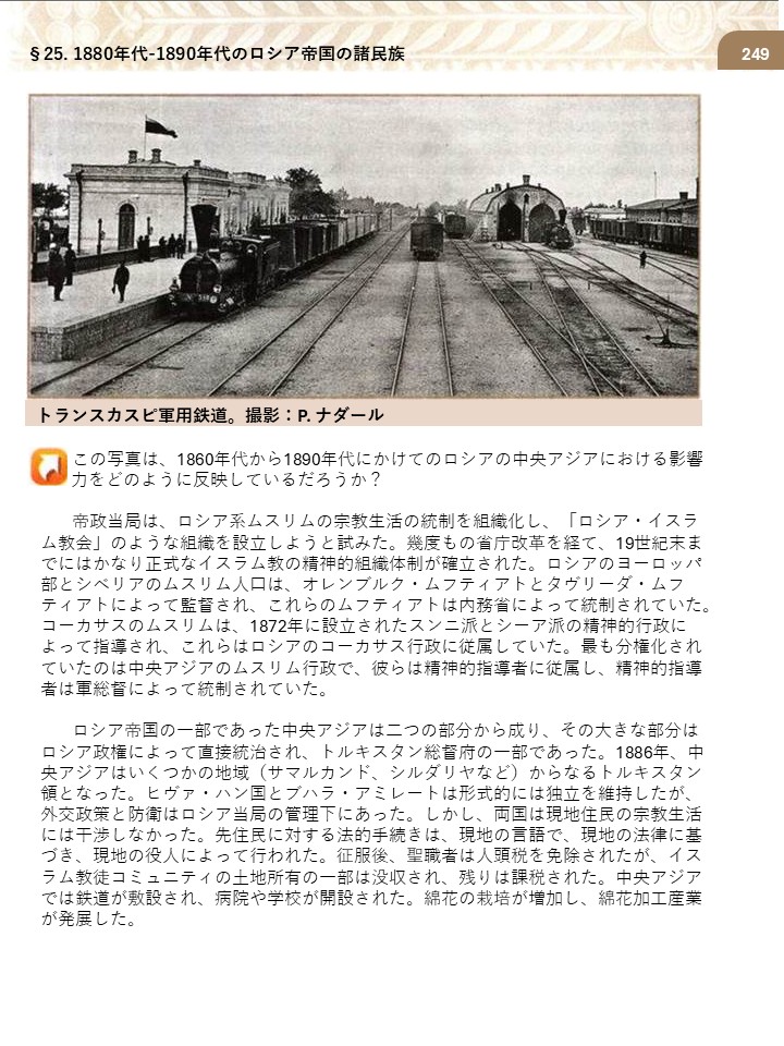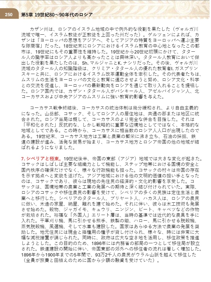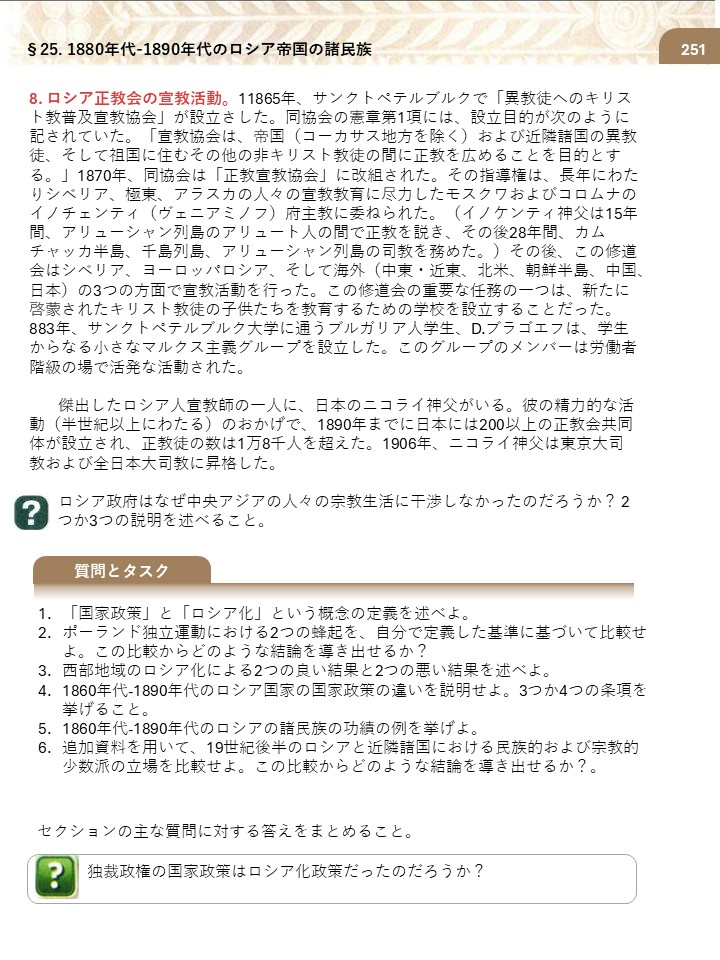 この範囲では日露戦争以外に見ておくべき重点は、おそらく「§25. 1860年代〜1890年代のロシア帝国の諸民族」。これは、ロシアによる周辺民族支配とロシア化について、ロシア公式見解という点で、他国からの見方との違いが関心点。