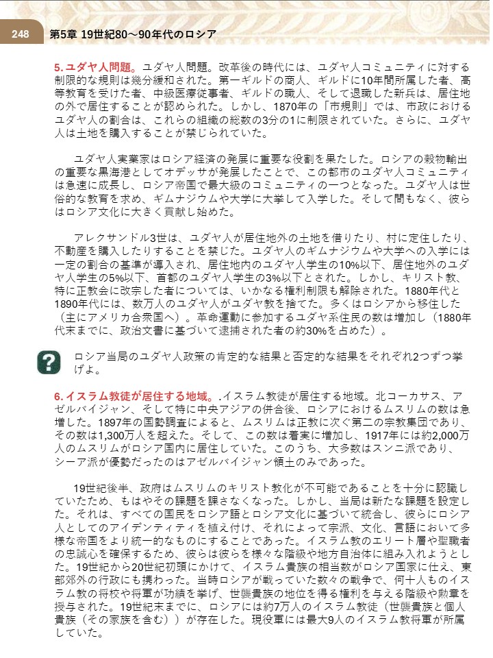 ロシア史の教科書の「セクションの問い」そのものは、おそらく教育的というより探究的に良い設問となっている。(ソ連時代からプーチン時代まで、模範解答が決まっていて、それに反することが評価されとは考えにくいが)