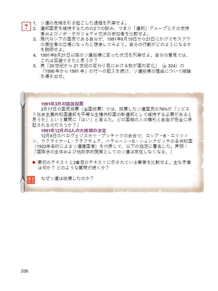 - プーチン政権の見方を反映し、セクション末の問いで「§ 18 の資料を振り返ろう。事実資料に基づいて、ソ連崩壊の条件はこの国家建設の原則に定められていたという教科書の著者の主張を肯定または反論せよ。」と問う。これは、レーニンが連邦共和国の自主的加盟と離脱を基本とする憲法にしたことを指す。