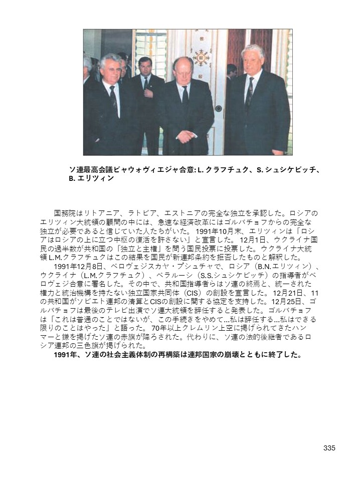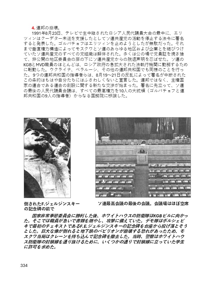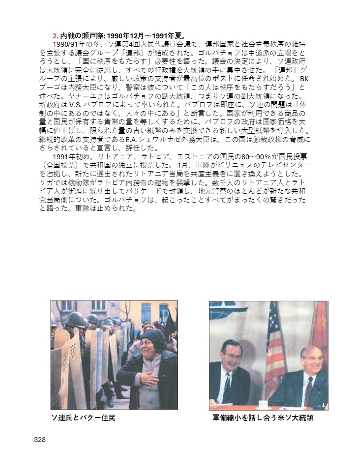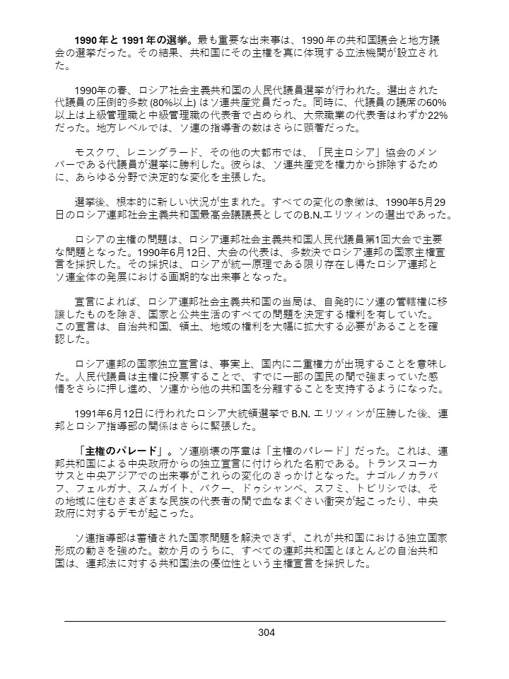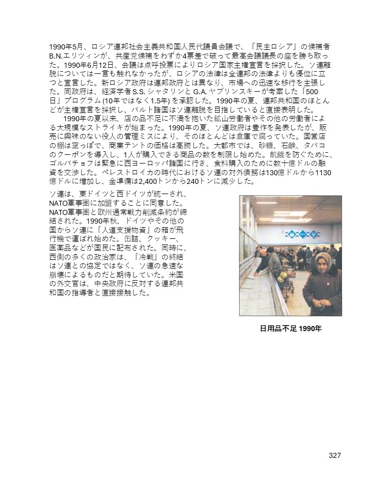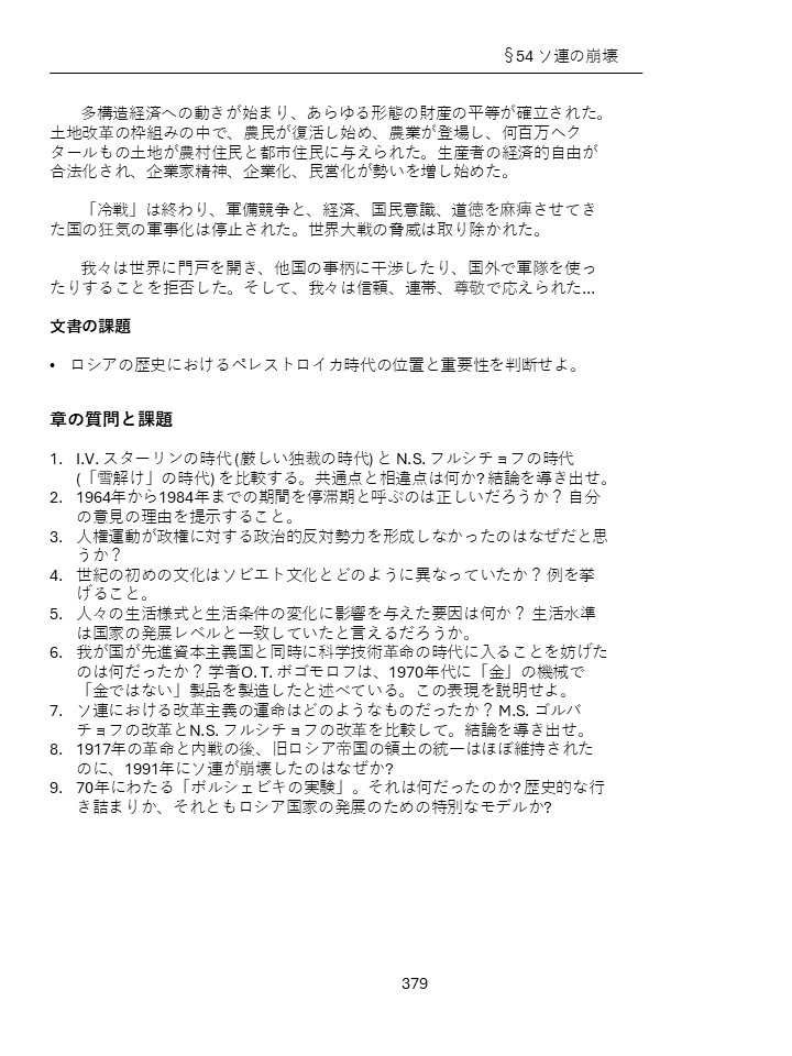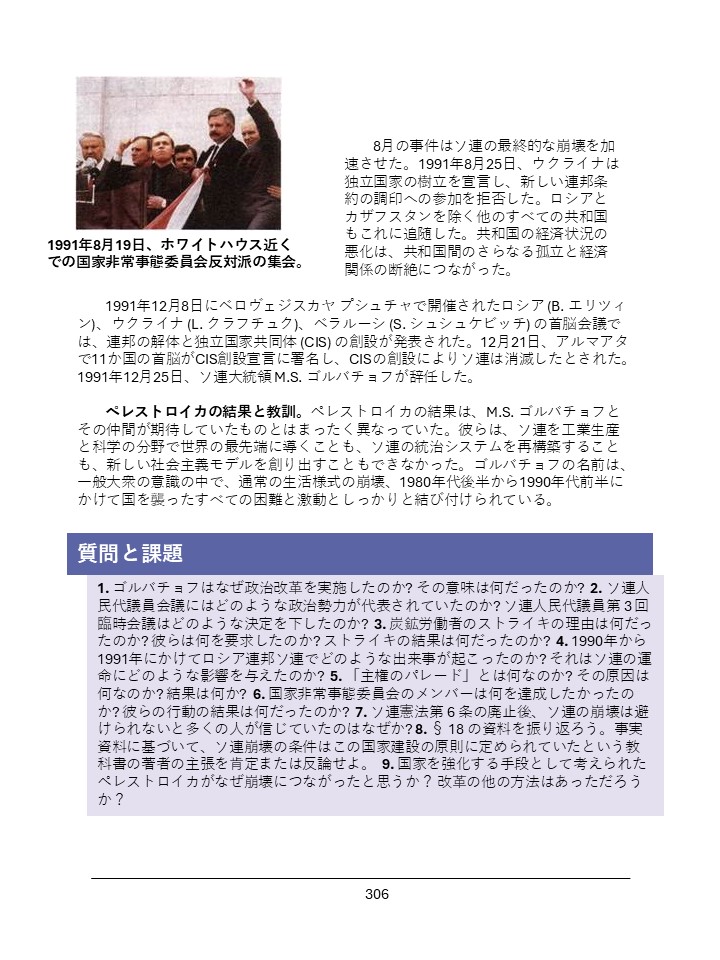 - セクション末の問いで「ソ連崩壊の理由について考えてみよう。M.S. ゴルバチョフはソ連崩壊の責任を負わされることがよくある。これは本当か?」と問いかけている。おそらくソ連崩壊は不可避だったかもしれないというエリツィン政権の見方の反映だろう。