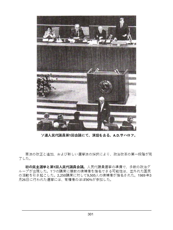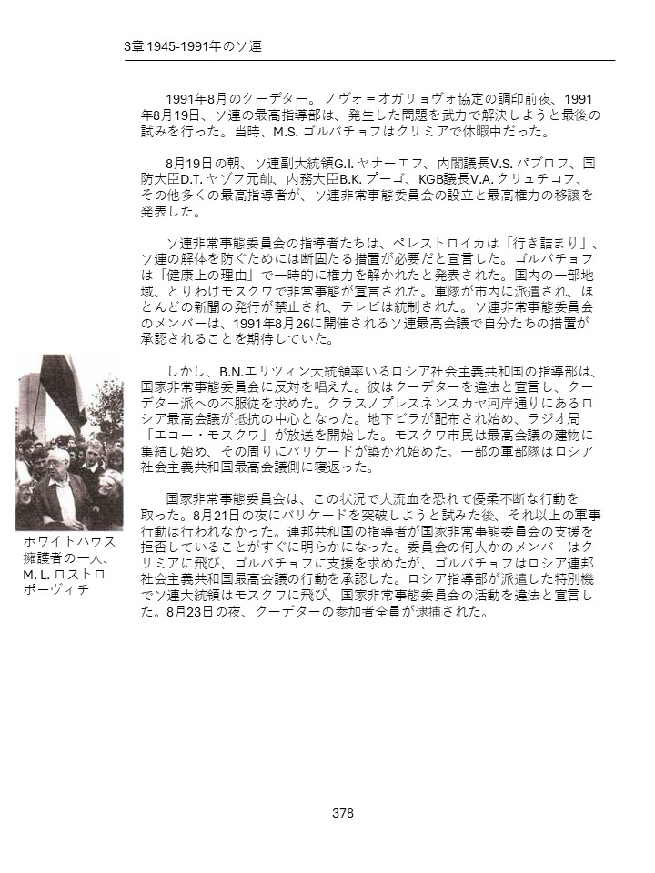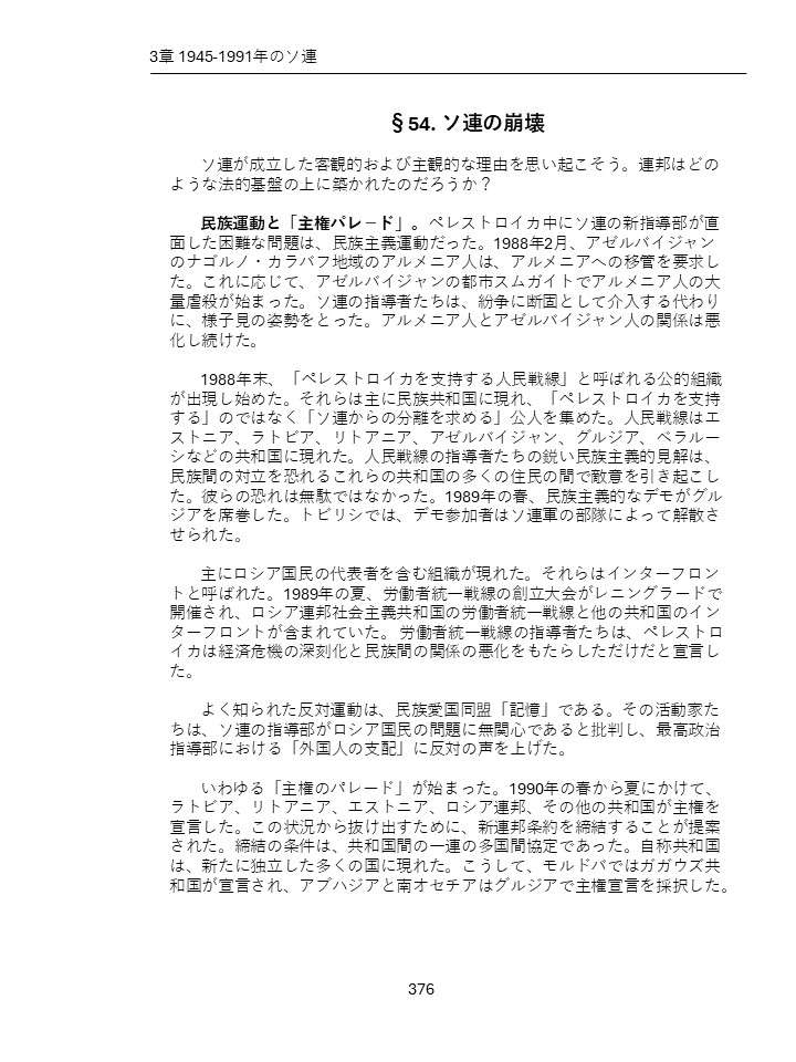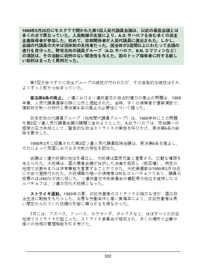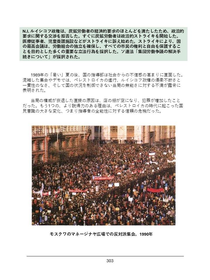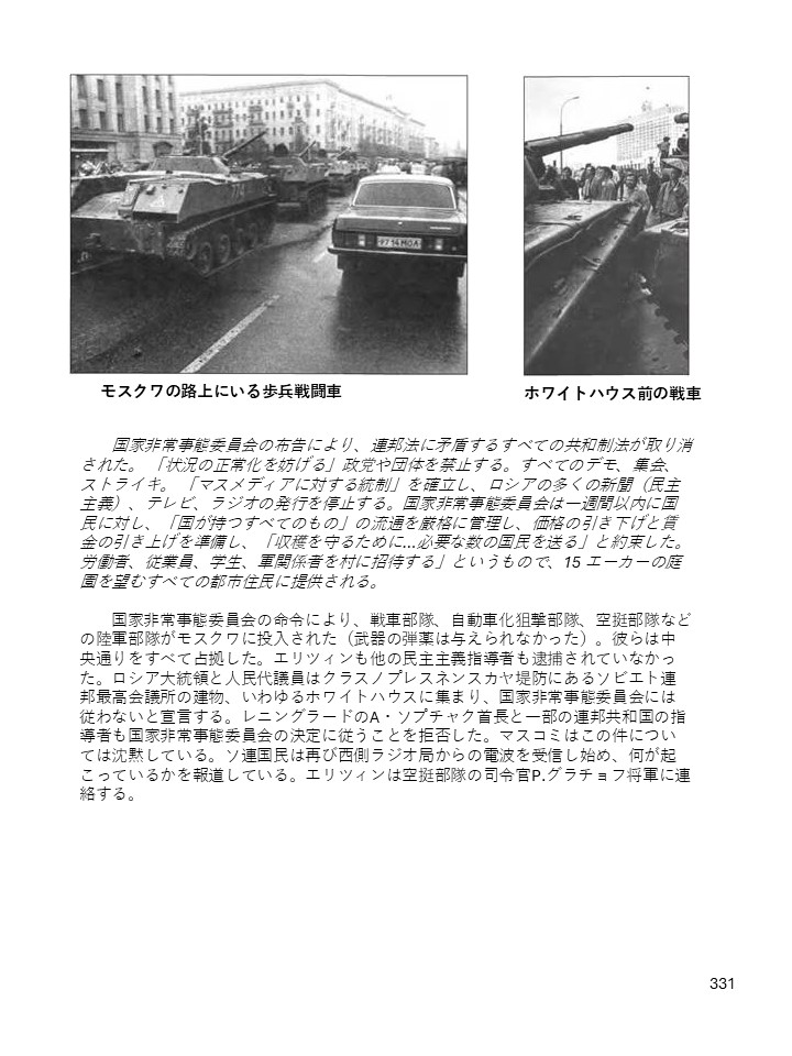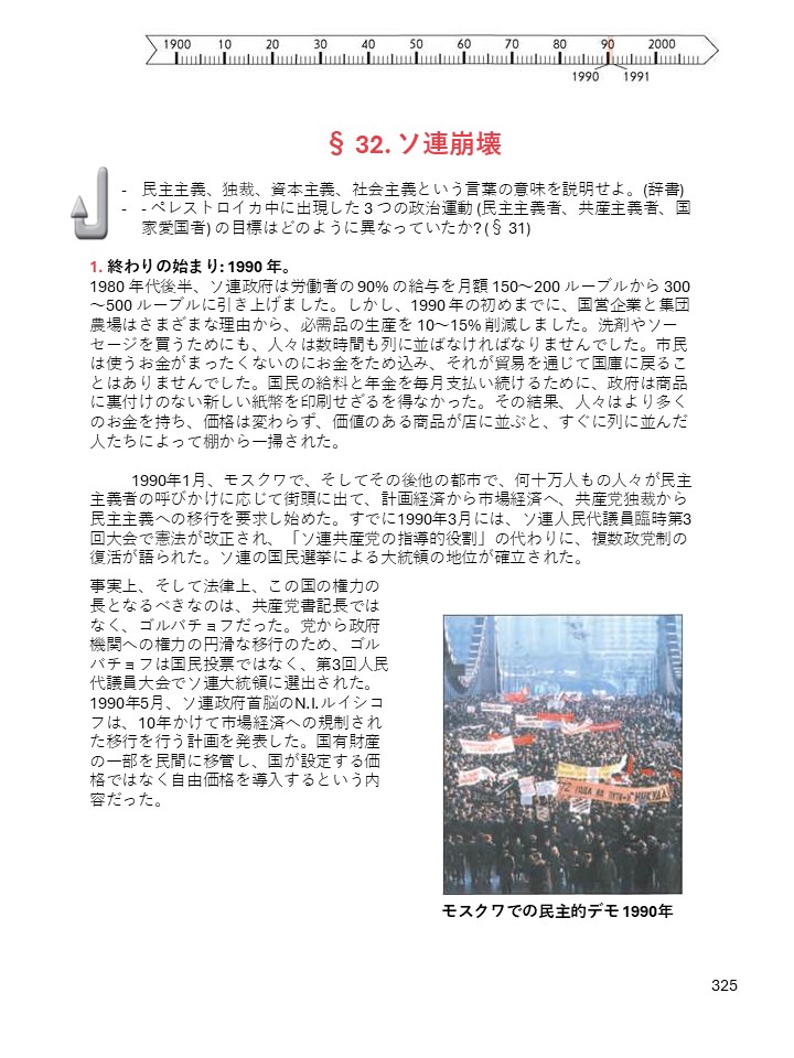 - セクション末の問いで「ソ連崩壊の理由について考えてみよう。M.S. ゴルバチョフはソ連崩壊の責任を負わされることがよくある。これは本当か?」と問いかけている。おそらくソ連崩壊は不可避だったかもしれないというエリツィン政権の見方の反映だろう。