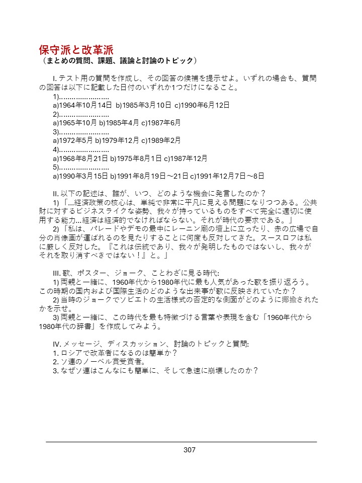 - さらに「 国家を強化する手段として考えられたペレストロイカがなぜ崩壊につながったと思うか? 改革の他の方法はあっただろうか?」と、ペレストロイカがソ連崩壊に至らせたことを前提とした問いかけをしている。