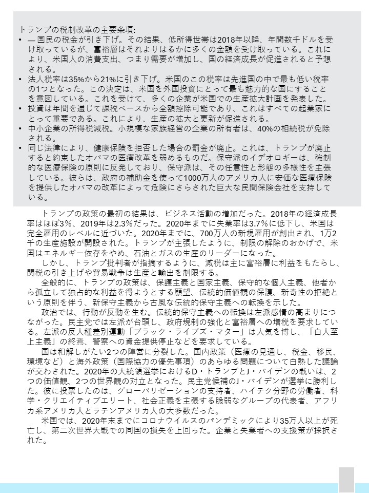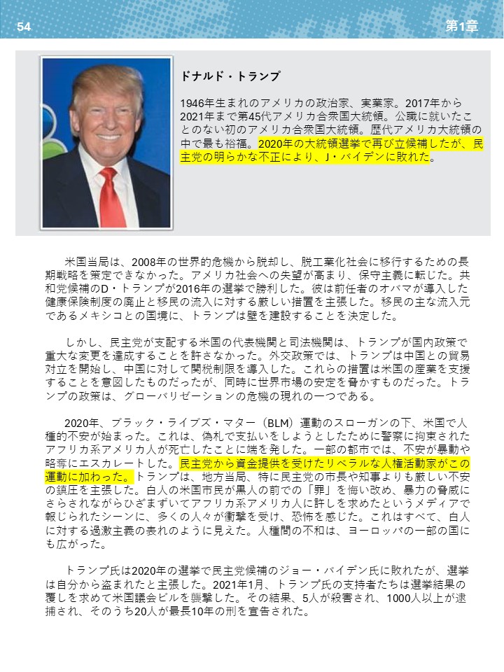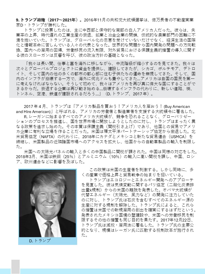 これら以外に、2023年発行のロシアの世界史教科書11学年用(別の出版社の教科書)が、トランプ政権についてセクション内のサブセクションひとつをわりあてて、記述している。わりと淡々とトランプ政権について記述して、こちらは特にロシアの国益と関連するような記述はみあたらない。セクション構成も異なるので、特別軍事作戦以前の教育課程にしたがっているのかもしれない。