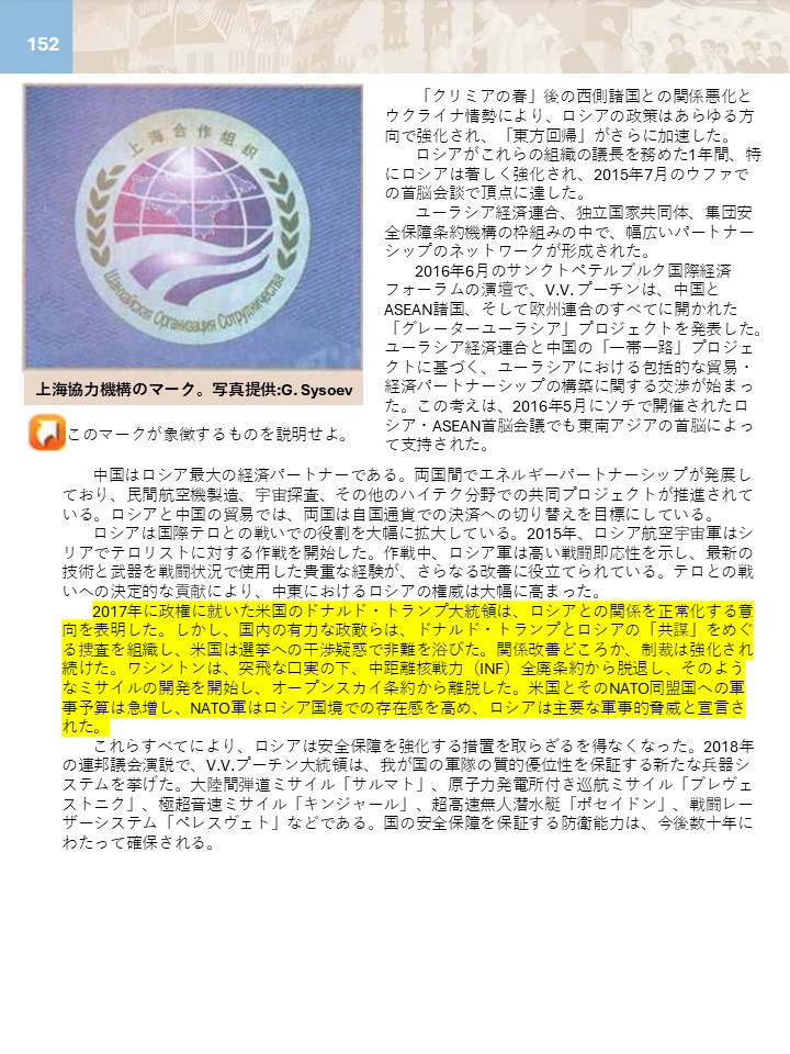 2024年発行のロシア史教科書9学年用(近現代史導入 1914-21世紀初頭)では、「2017年に政権に就いた米国のドナルド・トランプ大統領は、ロシアとの関係を正常化する意向を表明した。しかし、国内の有力な政敵らは、ドナルド・トランプとロシアの「共謀」をめぐる捜査を組織し、米国は選挙への干渉疑惑で非難を浴びた。関係改善どころか、制裁は強化され続けた。」として、トランプ政権ならロシアと米国の関係は良好なものになっていたはずだという思いが書かれている。実際にプーチン政権がそう考えているのかはわからないが、国民にはそう信じさせたようである。
