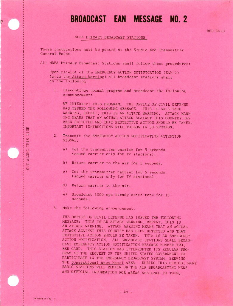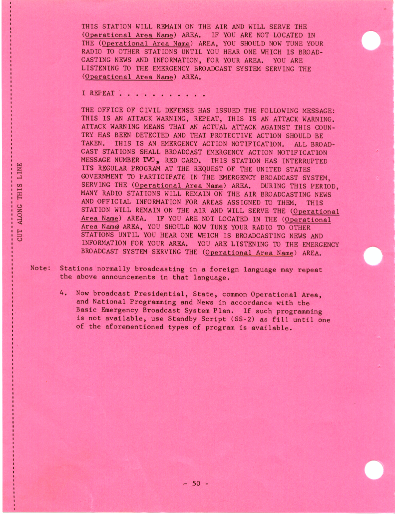 フィラデルフィアのラジオ局WFILが1970年代初頭に録音したEBS Emergency Action NotificationメッセージNo.2 レッドカード準拠の予定音声。最初の16秒はピーーーー。