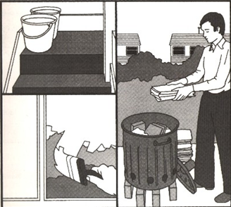 古新聞や燃えやすいものは捨てる。バケツに水を汲んでおく。窓は熱線を反射するために白く塗っておく。