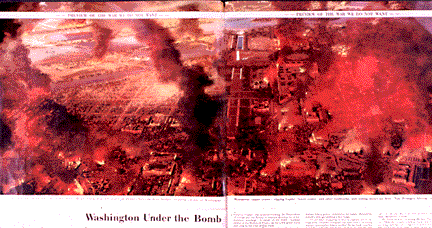 1953年7月22日、米軍はB-36編隊によるモスクは原爆攻撃を成功。20平方マイルの領域を破壊。数秒後に(前景の囲われた領域であある)クレムリンは忘却の彼方へ消え去り、これを取り囲む赤の広場は瓦礫の山と化す。聖ワシリイ大聖堂は消え去る。