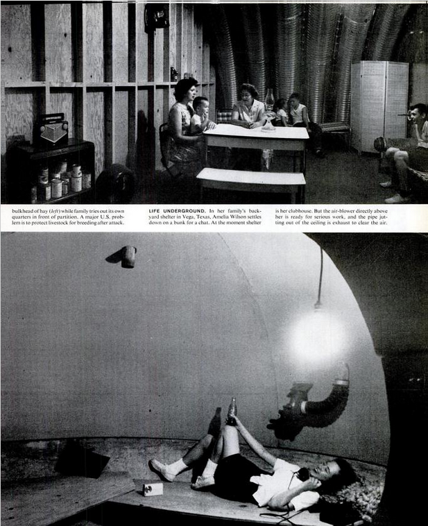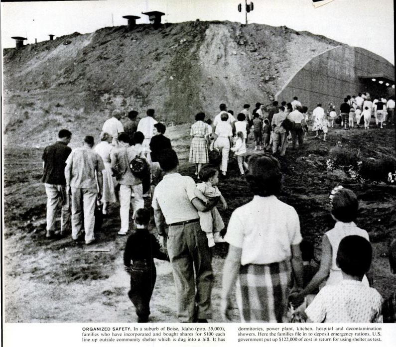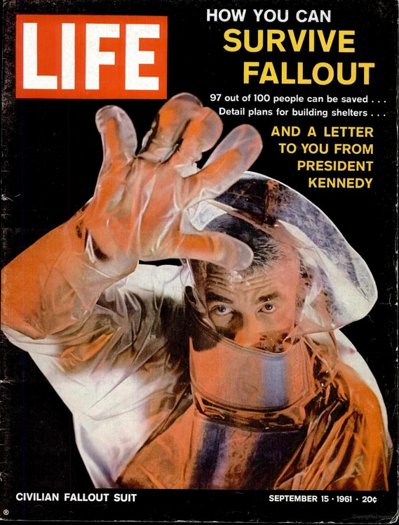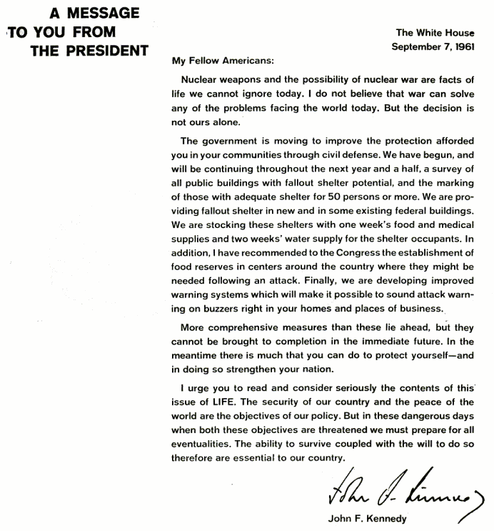 キューバ危機が起きた1962年10月15日から、13か月前の1961年9月15日付けの雑誌LIFEに、次のような記事が掲載されていた。その記事で、ジョン・F・ケネディ大統領は民間防衛の推進とシェルターの整備を訴えている。