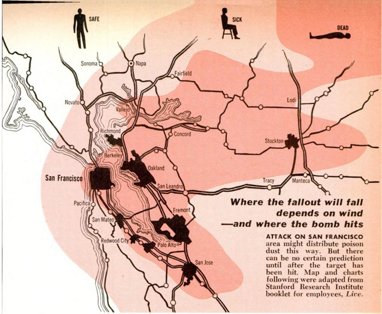 どこに放射性降下物が降るかは風と爆心地点に依存する。サンフランシスコ攻撃の場合、有毒な塵はこのように広がるかもしれない。しかし、攻撃目標が攻撃される前は確かな予測は立てられない。地図と図面はStanford Research Instituteの従業員向けブックレットからの引用。