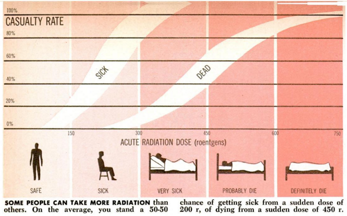 あたたは、宇宙線や夜光時計からのガンマ線に被曝している。量が少なければ、大した問題は起きない。量が増えれば、病気になる。しかし、その境界線は明確なものではない。被曝が集中すれば、より危険になる。24時間以内に450r被曝した場合、半数が死亡し、半数が生存する。生涯で450r被曝しても影響はない。