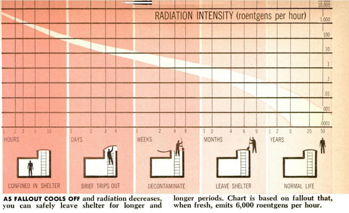 放射性降下物が冷えて、放射線が減少すると、より長い時間、核シェルターを離れることができる。図は当初、毎時6000レントゲンを放射する放射性降下物の例。