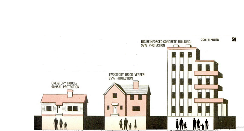 排水渠でも80%の放射線を遮蔽する。しかし、窓のないコクリート強化建築物の地下室は本当に安全である(99%遮蔽される)。