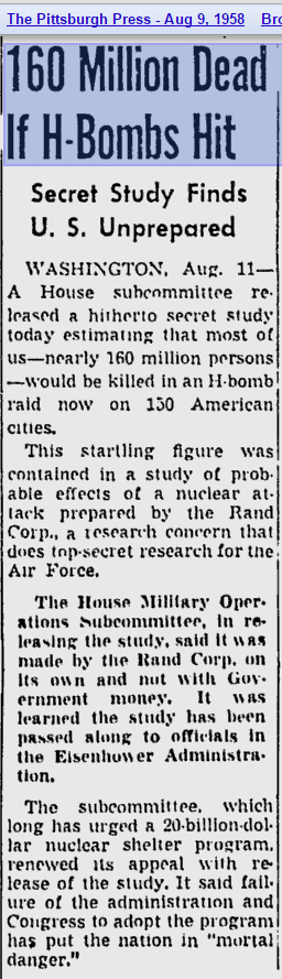 [ "160 Million dead If H-Bombs Hit" (1958/08/09) on The Pittsburgh Press ]