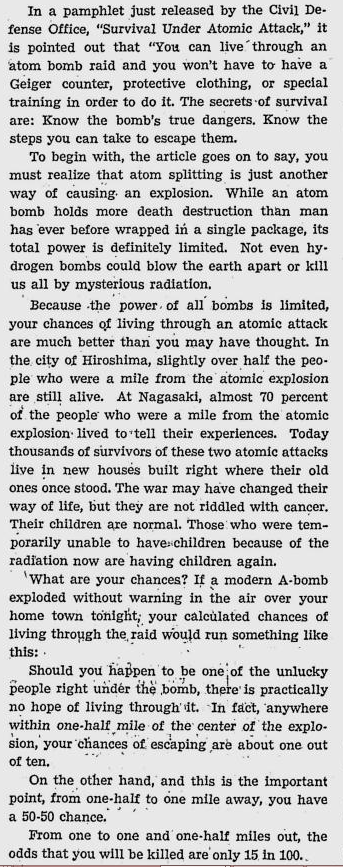 「You can survive, the government says (政府は、皆さんが生き残れると言っている) if you're lucky enough not to be right under the bomb explosion (もし幸運にも原爆の真下にいなくて)」という記述に、「実際はどうかわからないよ」という雰囲気が漂う記事である。