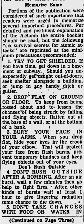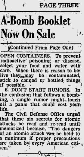 民間防衛局発行の"Survival Under Atomic Attack"という31ページのブックレットが昨日、全米で発売された。ブックレットは全国民が読むべきもので、米国政府が全国民の安全と生活に必要不可欠だと考えているものである。ブックレットは米国印刷局が発行し、10セントで販売されている。 [ Lodi News Sentinel (1950/11/29) ]