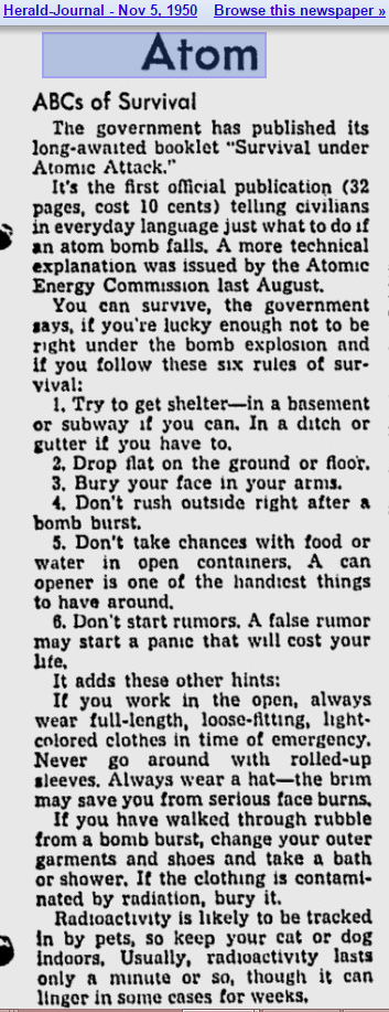 政府は長く待たれていたブックレット"Survival Under Atomic Attack"を発行した。この最初の公式出版物(32ページ、価格10セント)は、民間人に日常の言葉で、原爆が投下されたときに何をすべきかを語っている。より技術的な説明は、8月に既に原子力委員会が発行している。政府は、もし幸運にも原爆の真下にいなくて、6つの原則に従えば、皆さんが生き残れると言っている。