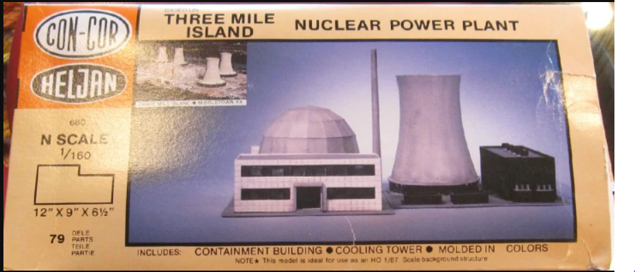 スリーマイル島に基づく原子力発電所のこのモデルは、パッケージの記述によれば「鉄道模型レイアウトにリアリズムと興奮を加える」ものである。こえは、イリノイ州ベセンビルのCon-Cor社のためにデンマークで製造された。小売価格は13.99ドルだった。もちろん、潜在的除染費用は考慮する必要がある。
