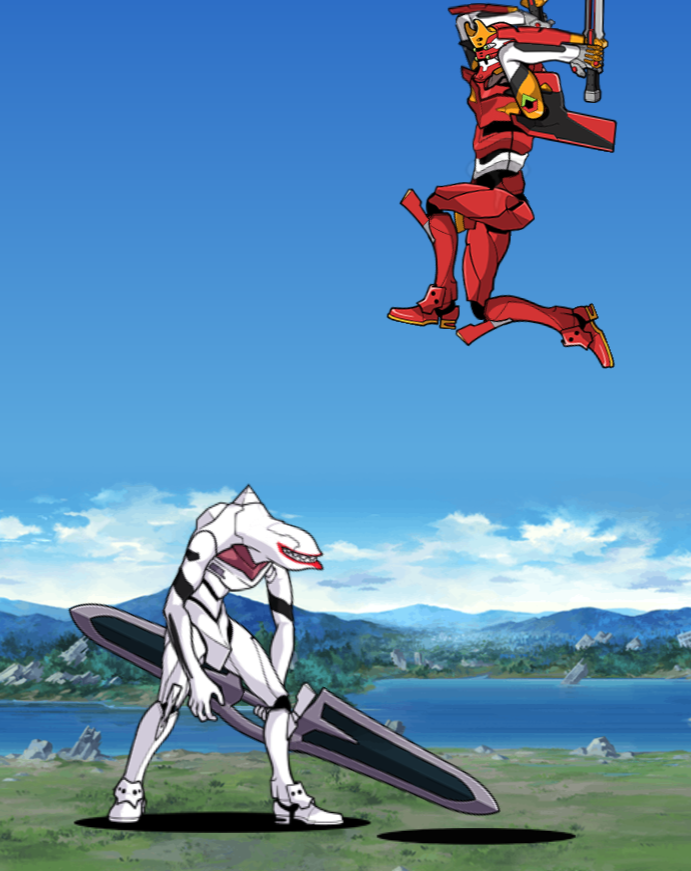 原作再現のためにネコがいない方が都合が良かったから第1形態なんだろうけど、2号機はジャンプするのでかなり画面の上側に行っちゃうし両腕と武器を振り上げてるから第2形態の頭にしがみ付いてるネコが見辛くなってしまうので、第2形態でこの画像を作ろうとしたら第1形態との違いが分かりにくくなるのでこのままで良いと思います。