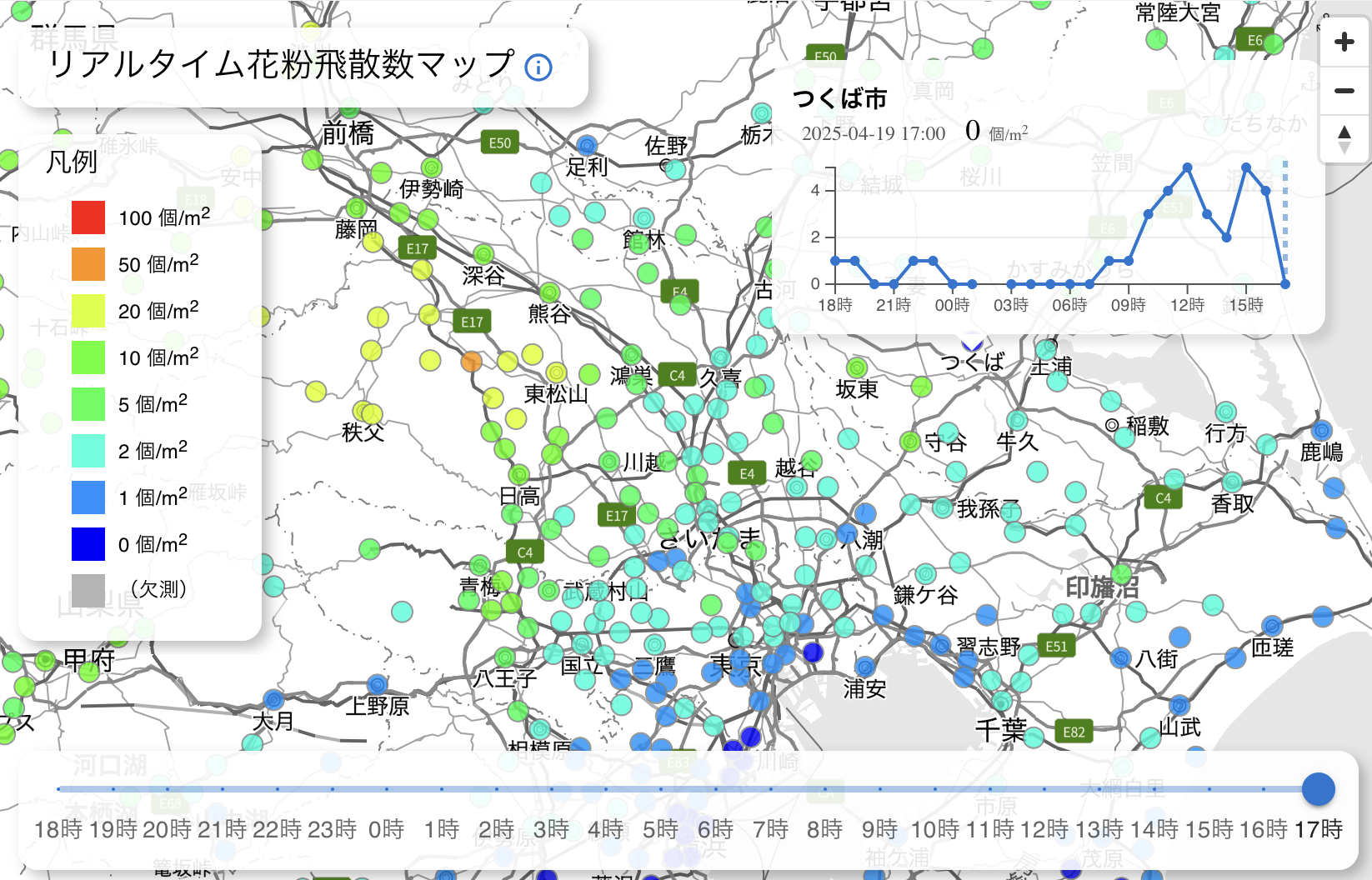 上の花粉の最新データをマップ上に表示するサイトを作ってくださった方がおられます。