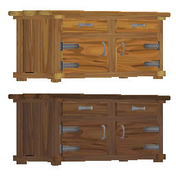 | 暗い木 | 腰の高さの棚。もし開けた引き出しを閉じる必要がないなら、一番下の引き出しから開けると中身の確認が効率的にできる。この知識が役に立つのは、泥棒か勇者くらいのものだろう。 |