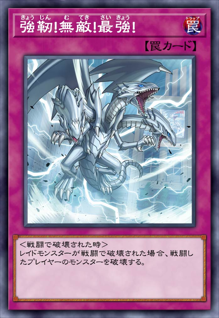 ![]() 《強靭!無敵!最強!》 | <戦闘で破壊された時> レイドモンスターが戦闘で破壊された場合、戦闘したプライヤーのモンスターを破壊する。 |