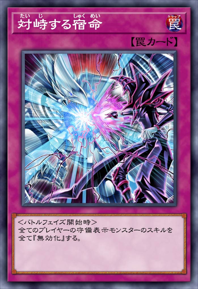 ![]() 《対峙する宿命》 | <バトルフェイズ開始時> 全てのプレイヤーの守備表示モンスターのスキルを全て『無効化』?する。 |