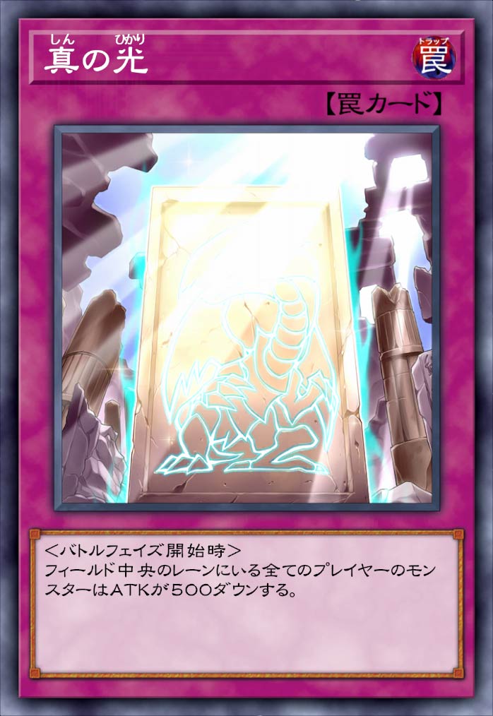 ![]() 《真の光》 | <バトルフェイズ開始時> フィールド中央のレーンにいる全てのプライヤーのモンスターはATKが500ダウンする。 |