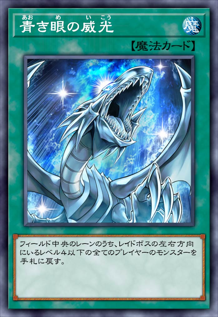 ![]() 《青き眼の威光》 | フィールド中央のレーンのうち、レイドボスの左右方向にいるレベル4以下の全てのプライヤーのモンスターを手札に戻す。 |