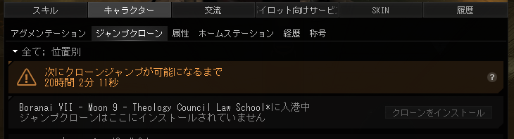 クローンジャンプを一度実行すると、次にクローンジャンプを実行可能になるまで24時間の待機時間が発生します。この時間はジャンプクローンタブで確認できます。