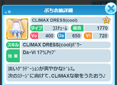 - MAX BEATのEDアニメーションで二宮飛鳥らが着ている衣装をアイテム化したものである。