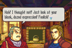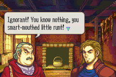ハッ!考えもしなかったのだろうが! その茫然とした、何も考えていない顔! 愚か者め! お前は貧しく、けちな家の出身なのだろう。そのぼろ布のマントを見れば なんと悲劇的なことかわかる! 推測するなら、スティール家の出か! それともウィンドランス家か! ふむ、もしかしたらライトブリンガーか? だがその眼付きの悪さから判断すると、ダークホルム家かもしれない。スピアガーデン家かローズ家の可能性も否定できないな! もしかしたらフレイムガード家の出身かもしれないぞ! 火遊びは好きか、大馬鹿者め? もしそうなら、アッシュバーン家の出かも知れないな! 平民の血筋だ!