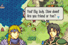 You ! Big lady. Slow down ! Are you friend or foe ? I'll stab any enemy, be they man or woman !