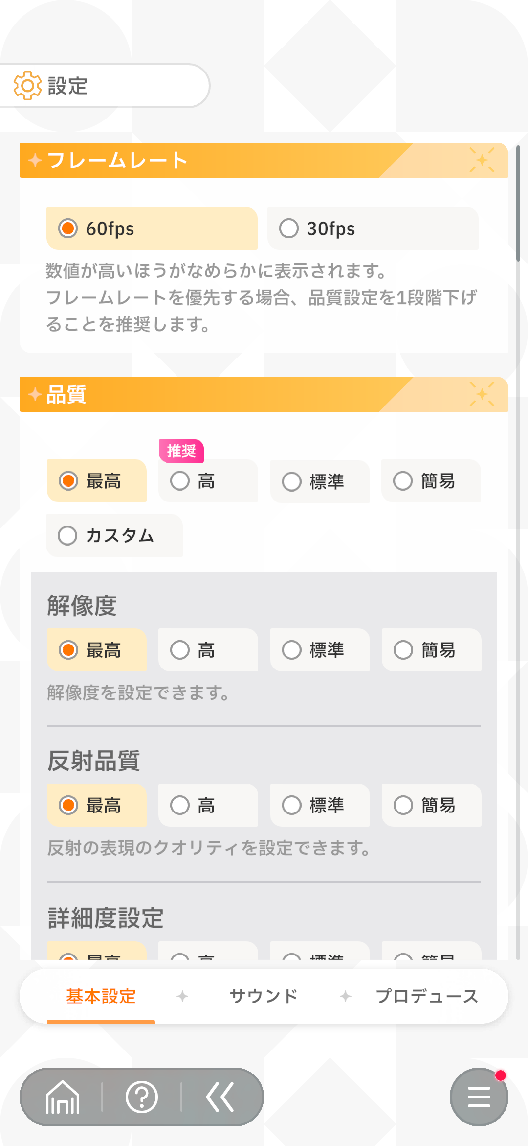 - 必須環境: 学園アイドルマスターを「品質設定: 高」が推奨設定となる環境。