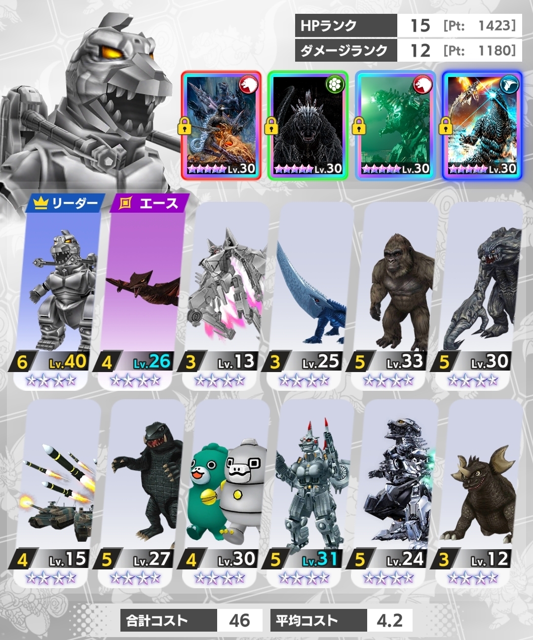 バトメモ揃ってる前提の話になってしまうが、このバトメモの組合せだと、5コストのゴジラ系をできるだけ入れた中コスト編成になる。