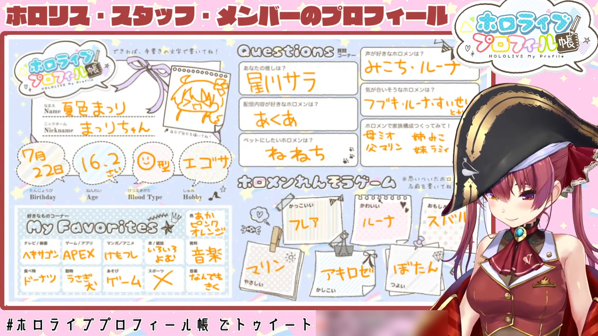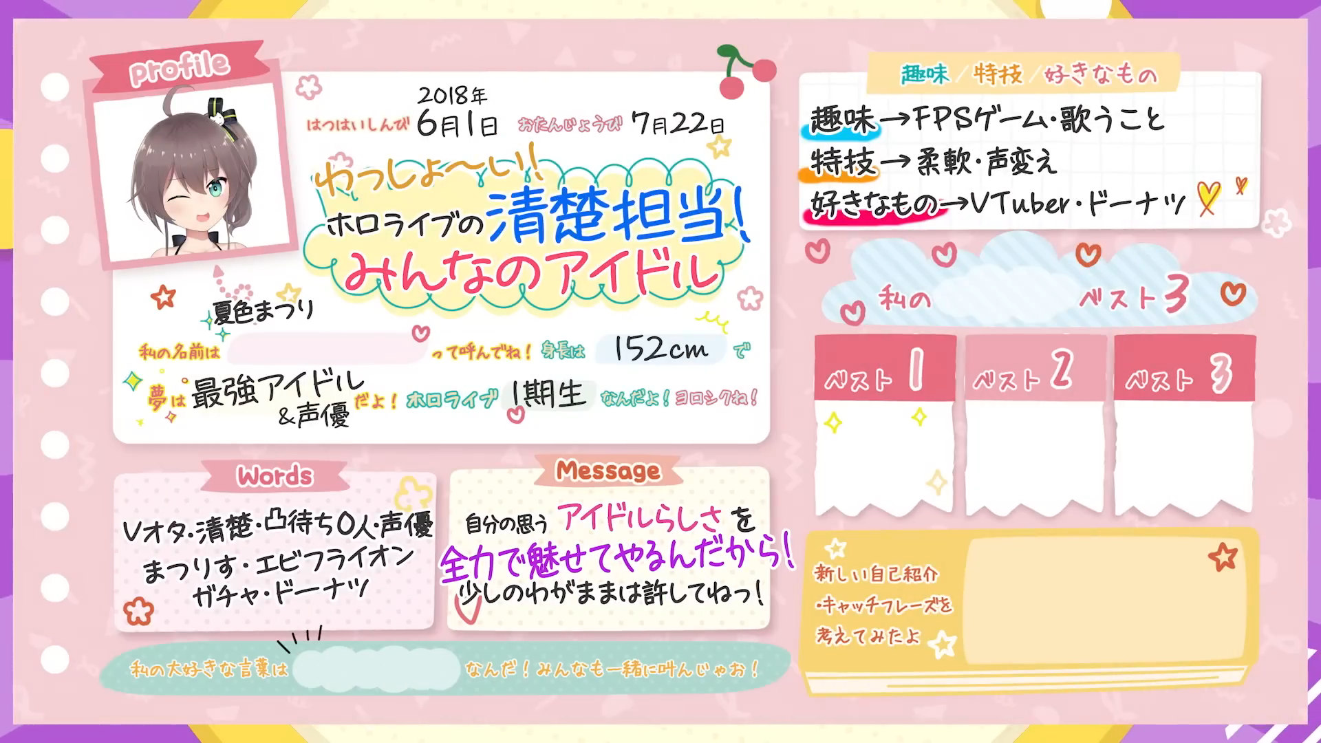 | 自己紹介 | ホロライブの清楚担当!みんなのアイドルゥ〜 なついろぉ〜(⤴️) ま〜つりで〜す! | リスナーが疑問符を浮かべることが多い |