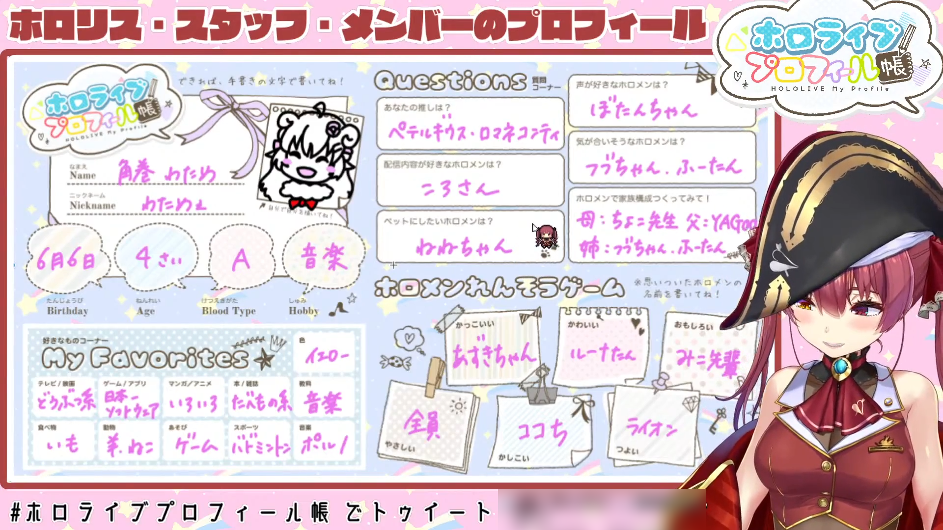| 自己紹介 | (ホロライブ4期生の角巻)わた↑めです | |