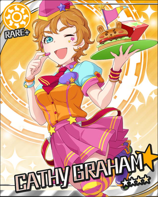 | アイドルコメント | 大好きすっき、ハンバーガー♪ はぁい♪ キャシーもこんな感じで見事アイドルデビューなのよー! どーよぉ? セクシーなあたしにみんなドキドキって感じかな! さ、皆の元にハンバーガーよりアツアツなキャシーをお届けよ! |